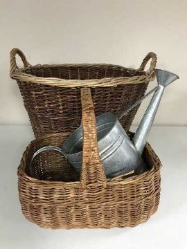A large wicker log basket containing a wicker hand basket, aluminium watering can, Keep Calm poster and two cushions