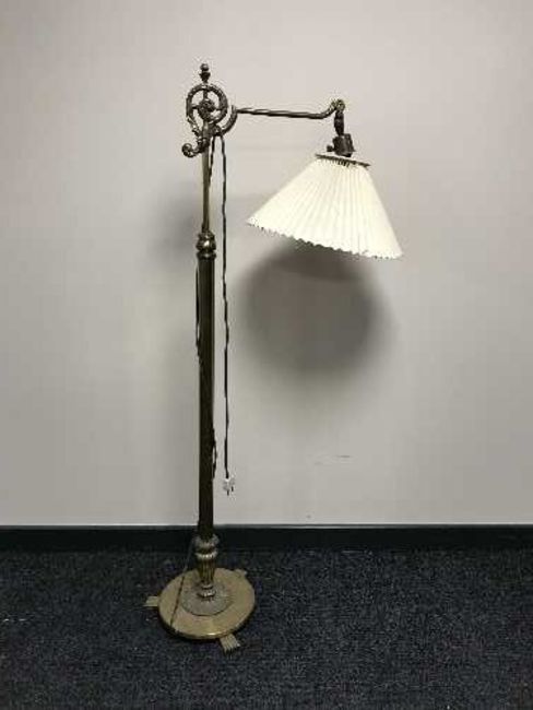 A heavy brass rise and fall standard lamp with shade