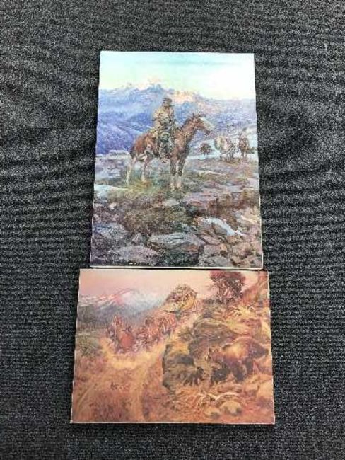 Six un-framed textured prints on canvas by Charles Marion Russell depicting cow boys and Native Americans
