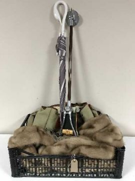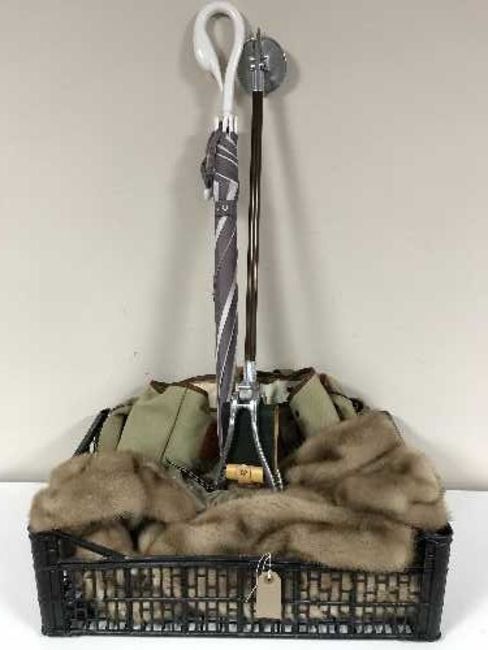 A box of fur coat, umbrella, boxed gent's shoes, shooting stick etc