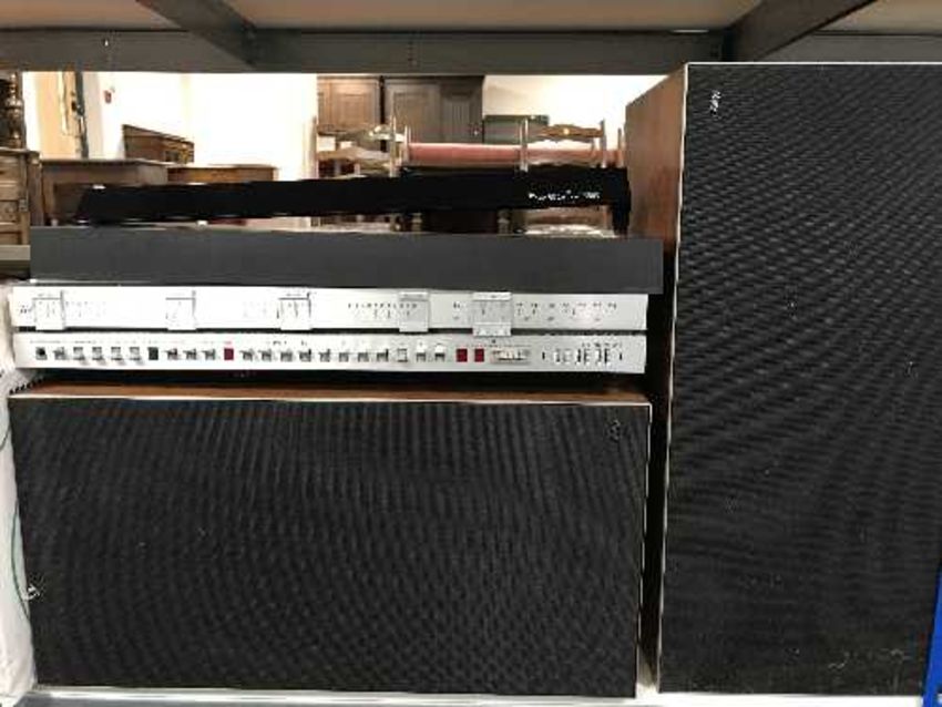 A Bang & Olufsen Beocentre 500 with speakers and a case and bag of LP records