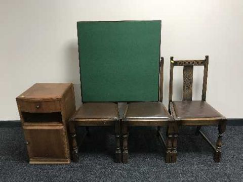 Three carved oak dining chairs, bedside cabinet and folding card table