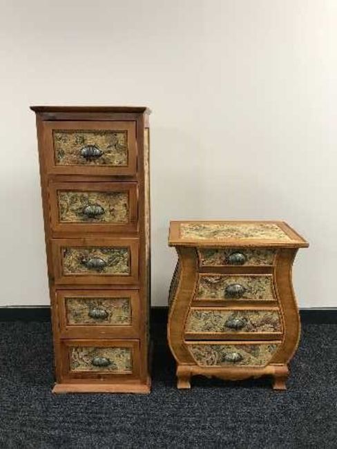 A contemporary pine and floral upholstered five drawer chest and matching four drawer chest