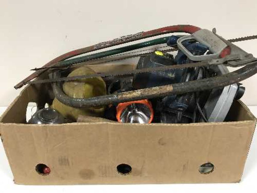 A box containing a wallpaper stripper, together with a cased Perles router, hand tools, hand saws etc