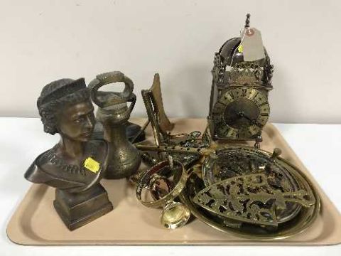 A tray of brass and copper ware inc. copper bust of Queen Elizabeth, brass weight, flat irons and a brass domed carriage clock