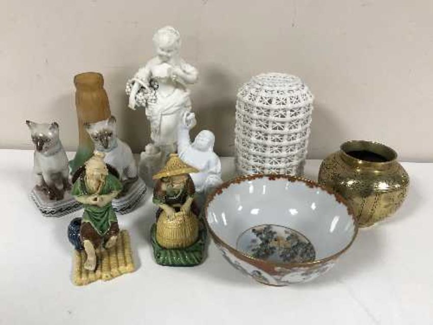 A Japanese Kutani porcelain bowl painted with a village landscape, signed, together with a Chinese brass bowl with character mark, figure of a buddha, pair of Chinese earthenware figures, 19th century parian figure of a girl, pair of seated cats, reticulated vase, lightshade etc (Q)