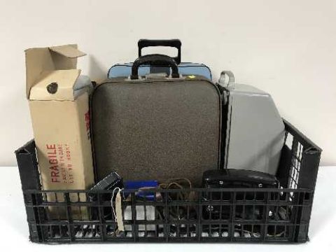 A box of typewriters, camera equipment and a vintage RGD Rapier TV