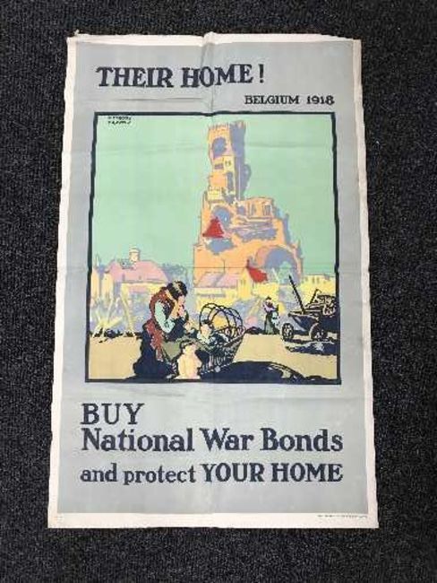 A WWI They're home Belgium 1918 By National War Bounds and Protect Your Home Poster, by F. Gregory Brown with a Liverpool Weekly Post Almanac game