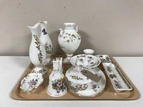 A tray of fourteen pieces of floral bone china inc. Royal Crown Derby posies, vase and dish, Aynsley cottage garden vases and mantel clock, Coalport Ming rose dish, etc
