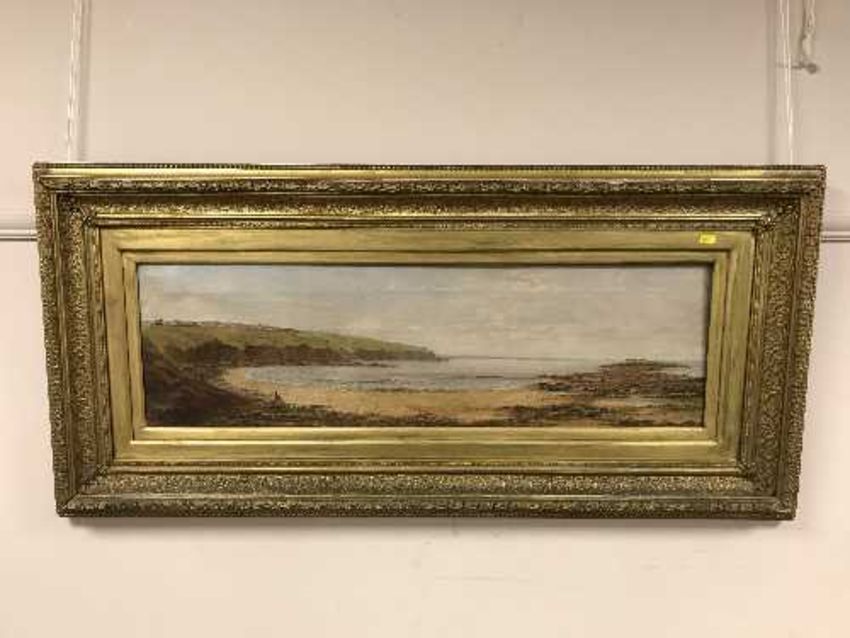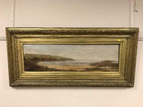 19th century school : The Northumberland coast, oil on canvas, indistinctly signed, 90cm x 26cm, framed.