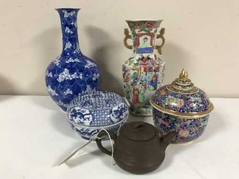 A Chinese porcelain prunus decorated vase, together with a Chinese porcelain incense burner and cover with character mark to base, a polychrome painted bowl and cover, Chinese stoneware teapot, Canton porcelain vase (5)