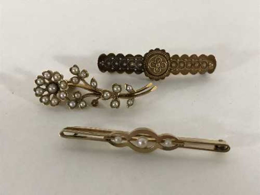 Three 15ct gold brooches, two set with pearls, 8.65g
