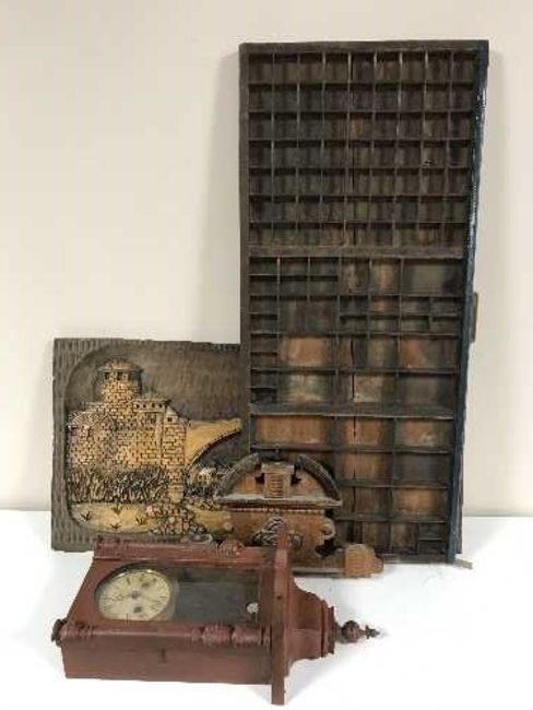 A folding child's chair, wall clock, chess board, carved wall plaque, printer's type tray etc