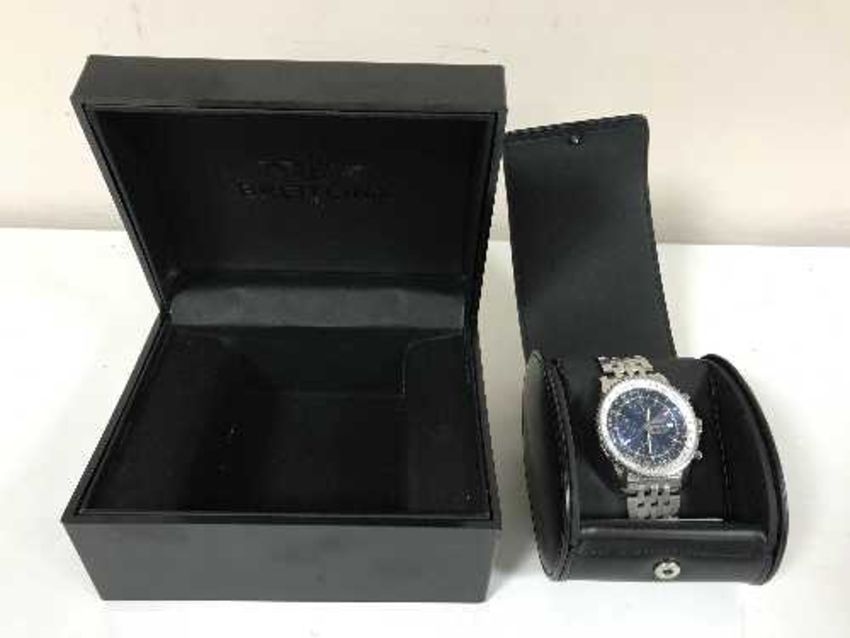 A Breitling Blackbird stainless steel wrist watch, Serial Number A44359, the circular black dial with luminous hands, bordered by a minute track, date aperture set to twelve o'clock, subsidiary recorder dials to three, six, and nine o'clock, on stainless steel bracelet, bracelet number 1884, dial diameter 32mm, with outer packaging and related documentation.