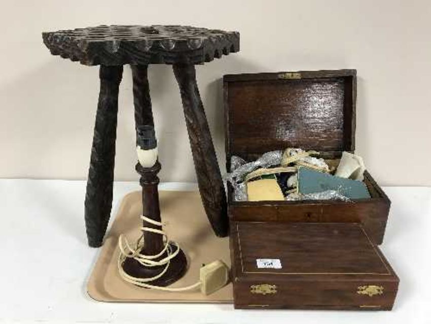 A tray of antique pine sewing box, wooden table lamp, cased tortoiseshell style brush set