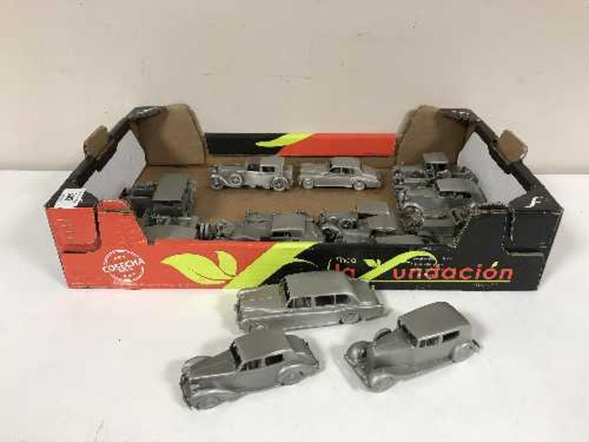 A box containing approximately 22 model pewter cars including Danbury Mint 1936 Rolls Royce, 1930 Phantom etc