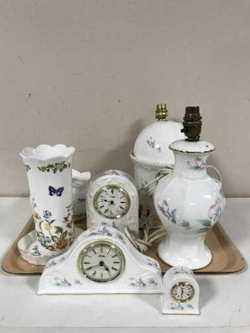 A tray of two Aynsley little sweet heart china table lamps, mantel clock and planter, cottage garden and Pembroke china