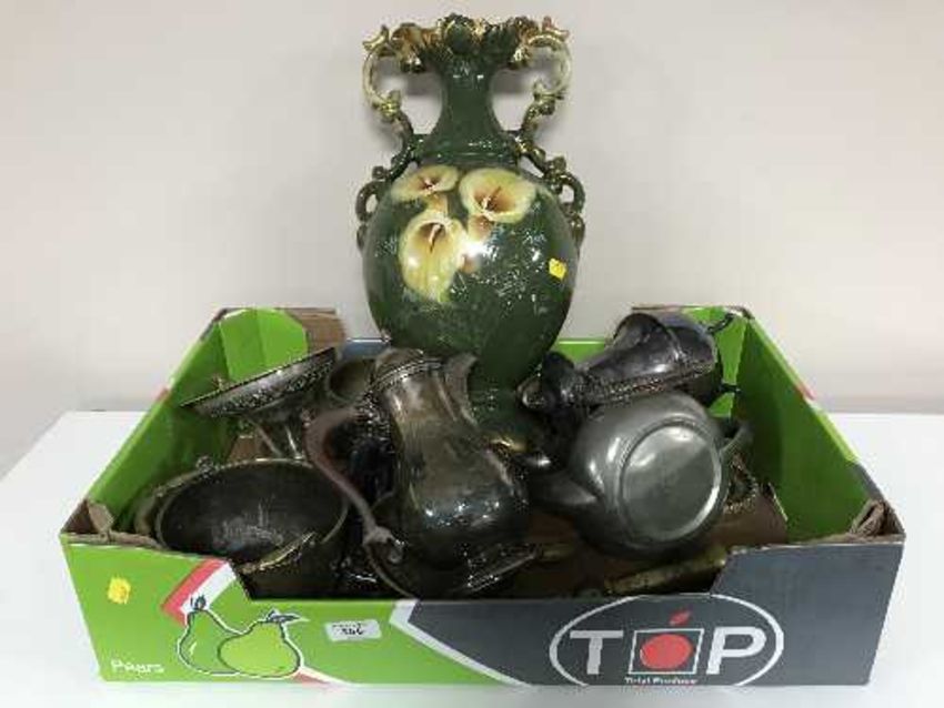 Two boxes of silver plated ware, early 20th century transfer printed vase, tea china etc