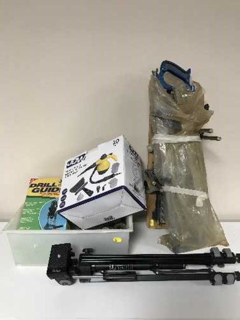 A box containing drill guide, hand tools, steam cleaner, camera tripod etc
