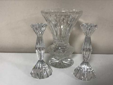 A pair of good quality crystal candlesticks and a crystal vase