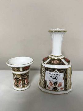 A Royal Crown Derby table bell, pattern 1128 with a small miniature Royal Crown Derby vase of the same pattern