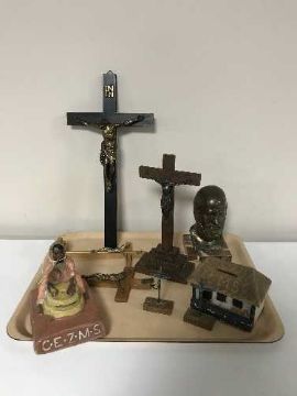 A tray of crucifixes, cast metal bust of Hippocrates, cast metal religious icon etc