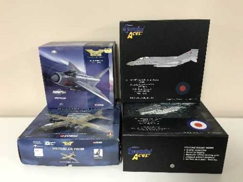 A Corgi jet fighter model, a military air power and two Gemini Aces in boxes