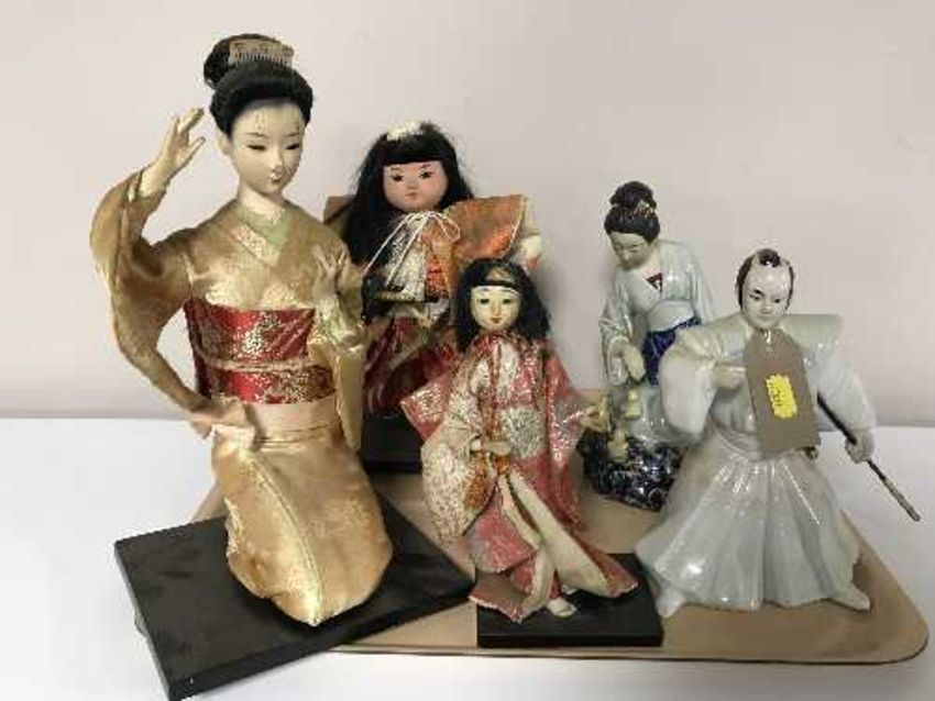 Four Japanese geisha figures and a figure of a Samurai