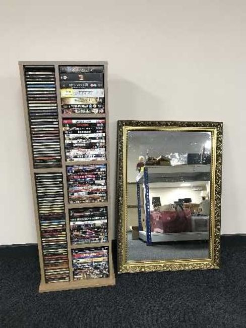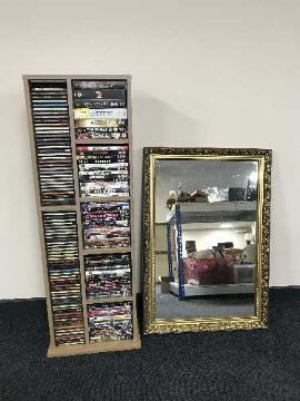 A contemporary set of open shelves, CDs, DVDs and a gilt framed mirror