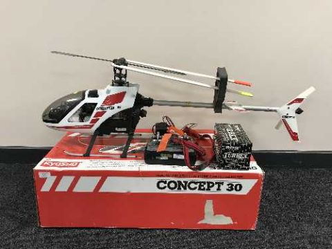 A Concept 30 petrol r.c. helicopter, control unit, boxed model engine starter and bag of accessories