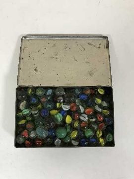 An antique tin containing marbles