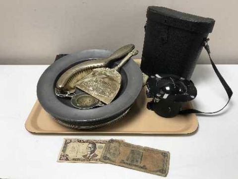A tray of ship's compass, plated hearth brush and shovel, bank notes, binoculars in case, one volume - Atlas of anatomy etc