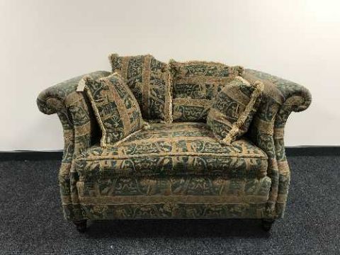 A Barker and Stonehouse love seat upholstered in green and gold print with scatter cushions