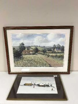A collection of eight framed pictures and prints including an oil - Figures in Winter landscape, signed John J Kerr limited edition print 88/150, R Marshall signed limited edition print - Transporter Bridge etc . (8)
