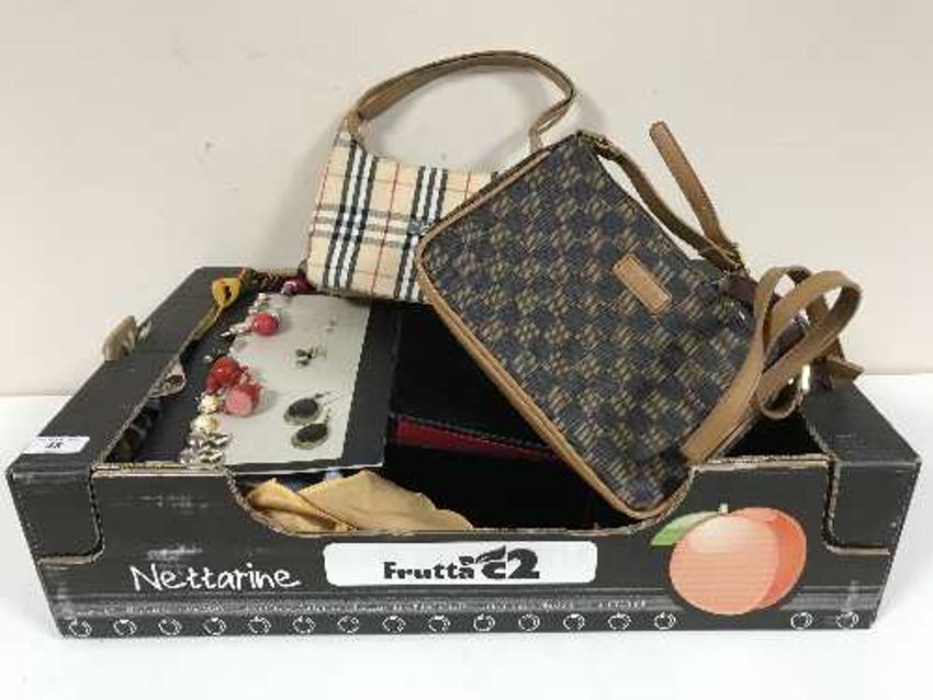 A box of handbags, costume jewellery, ladies scarves etc