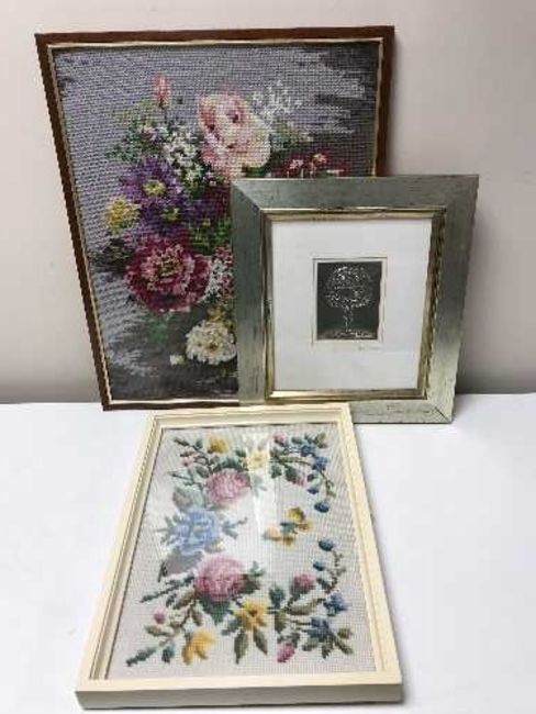 A pine framed oil - Lake with mountains beyond, together with framed watercolour by I M Strachan, four framed tapestries, photograph frame and pewter panel titled Rose Tree