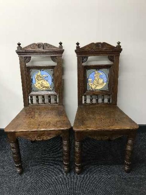 A pair aesthetic movement late nineteenth century hall chairs with tiled backs by John Moyr Smith, width 47 cm (2)
