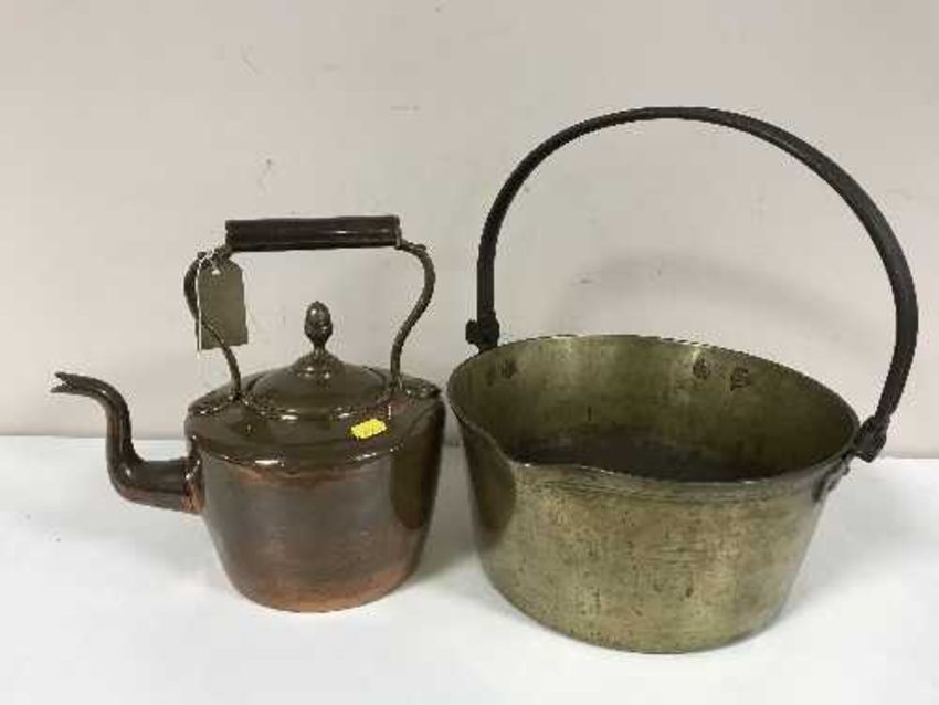 A vintage brass jam pan together with an antique copper kettle