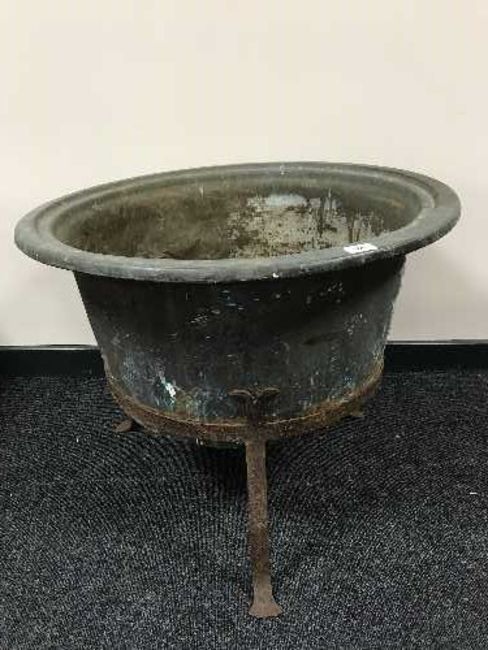 An antique copper planter on cast metal three way stand, width 74 cm.