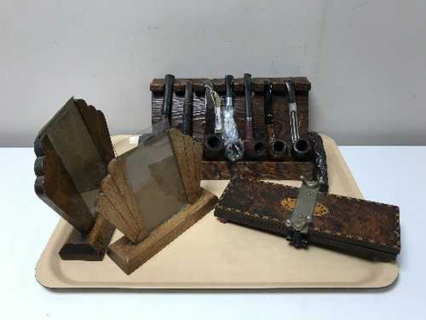 A tray of wooden pipe rack, pipes, inlaid tie press, three Edwardian oak picture frames etc