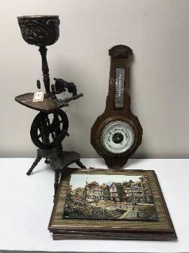 An oak smoker's stand in the form of a spinning wheel, oak barometer and four framed pictures