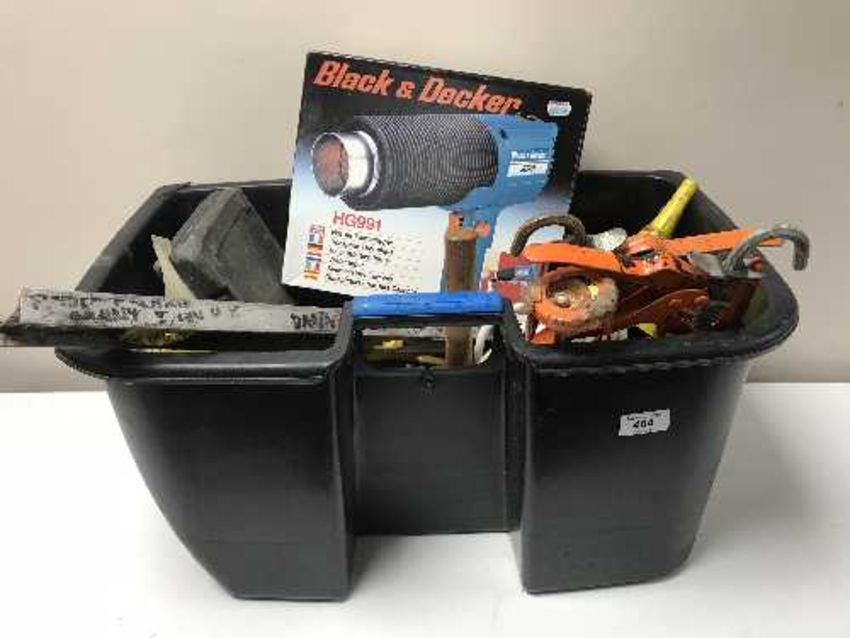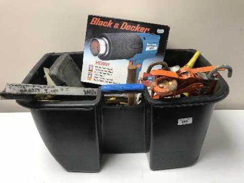 A box of hand tools, extension leads, black and decker heat gun, jig saw etc
