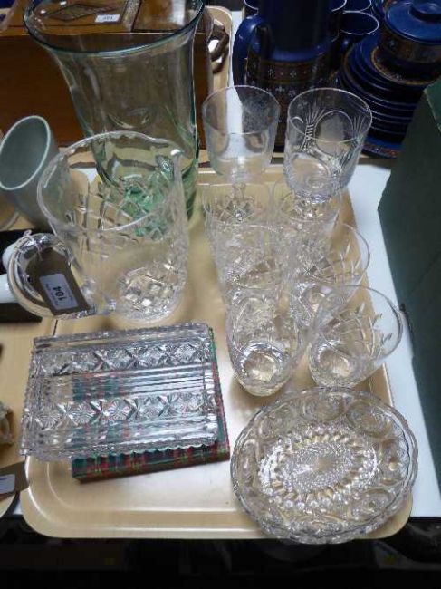 A tray containing commemorative etched glasses, a hand-blown green glass vase, a lead crystal water jug and six tumblers, lead crystal table box etc