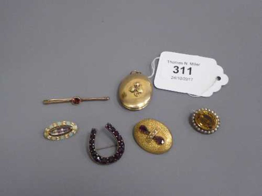 A collection of five Victorian brooches and a rolled gold locket. (6)
