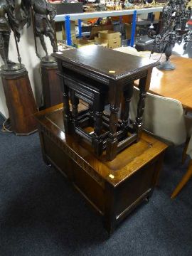 An oak blanket box and a nest of three oak tables