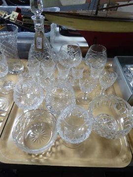 A tray of cut glass wine glasses, brandy glasses, decanter and stopper etc