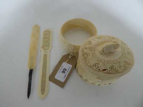 A carved bone trinket box depicting elephants, carved bangle, carved letter opener and bone handled knife