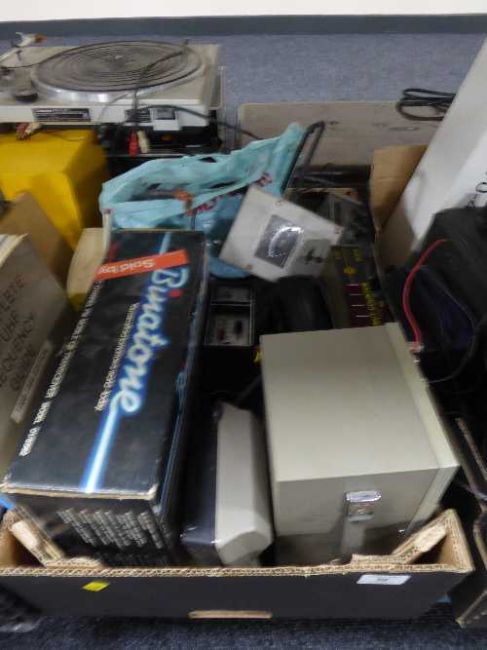 A box and a crate of radio communication equipment inc. a frequency range signal generator, frequency counters, boxed Binatone 40 channel transceiver, books, microphones, leads etc