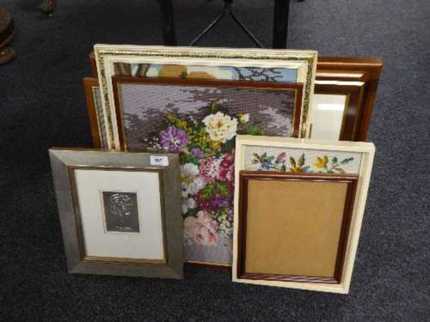 A pine framed oil - Lake with mountains beyond, together with framed watercolour by I M Strachan, four framed tapestries, photograph frame and pewter panel titled Rose Tree
