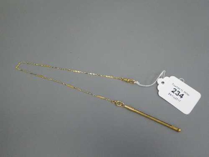A 9ct gold propelling pencil (5.3g )suspended upon an 18ct gold chain (5.7g)